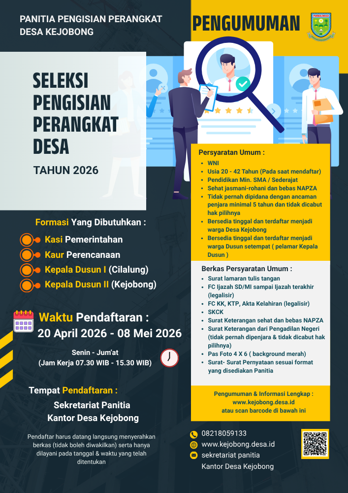 Pemerintah Desa Kejobong Pemerintah Desa Kejobong melalui Panitia Pengisian Perangkat Desa resmi membuka pendaftaran bagi putra-putri terbaik bangsa untuk bergabung dan mengabdi sebagai Perangkat Desa Kejobong Tahun 2026. erdasarkan kebutuhan organisasi pemerintah desa, terdapat beberapa 4 (empat) formasi jabatan yang kosong dan perlu segera diisi untuk meningkatkan pelayanan kepada masyarakat, yakni :